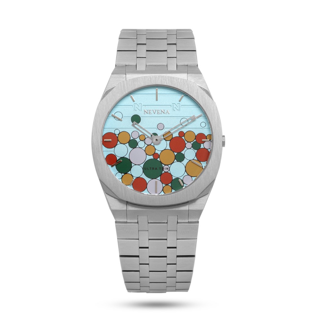 - ميناء الساعة بلون فيروزي و دوائر ملونه تجلب الأنظار.