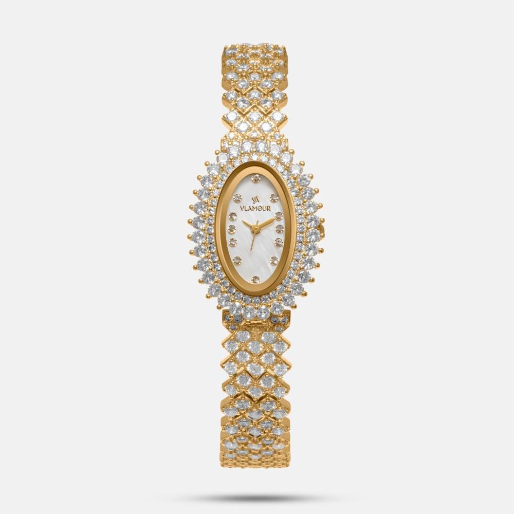تجمع ساعة زركون نسائية بلون ذهبي من فلامور بين الأناقة العصرية والدقة العملية التي تليق بكل إطلالة راقية. تصميمها يجمع بين الميناء الأبيض اللؤلؤي والإطار المرصع بفصوص الزركون، ما يمنحها حضورًا لافتًا على المعصم. إضافة إلى ذلك، تم تصنيع السوار من الفولاذ المقاوم للصدأ باللون الذهبي ليمنح مظهراً أنيقاً مع متانة عالية تضمن الاستخدام اليومي براحة وثبات. الآلية اليابانية الدقيقة توفر أداءً عمليًا يعتمد عليه وتزيد من قيمة الساعة كإكسسوار فاخر وعملي في الوقت نفسه.