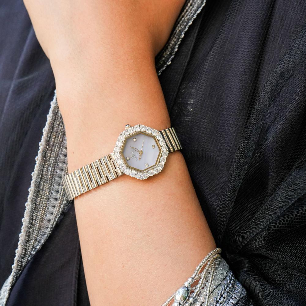 - الإطار المرصع بفصوص الزيركون يضفي لمسة فاخرة تزيد من جمال الساعة دون مبالغة.