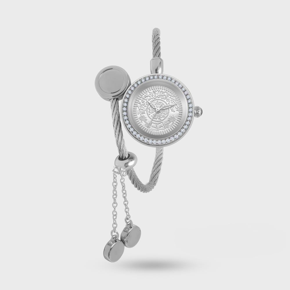 • السوار: باللون الفضي وتصميم عصري مريح، مصنوع من الفولاذ المقاوم للصدأ الذي يتميز بخفة وزنه ومقاومته العالية للتآكل والصدأ.