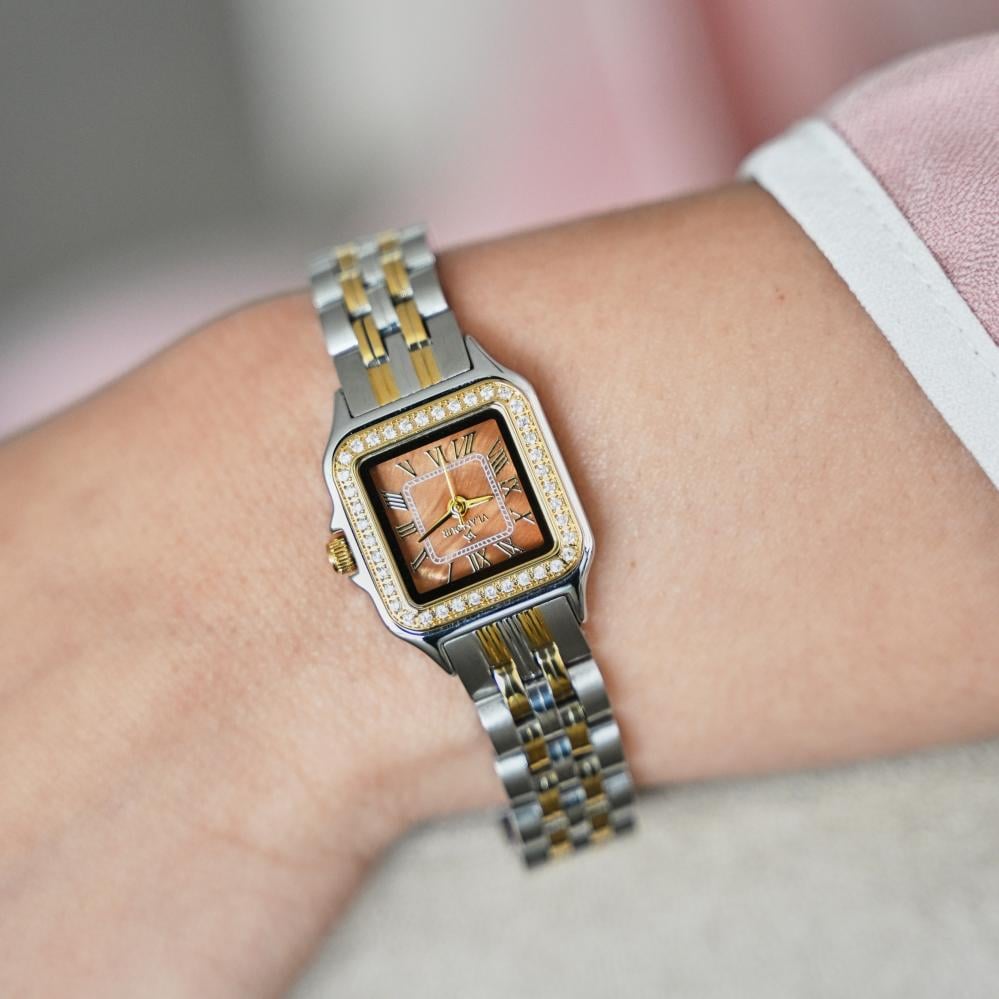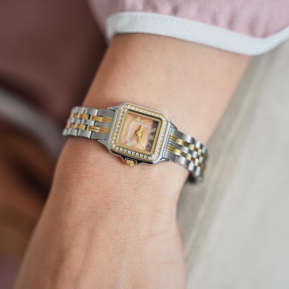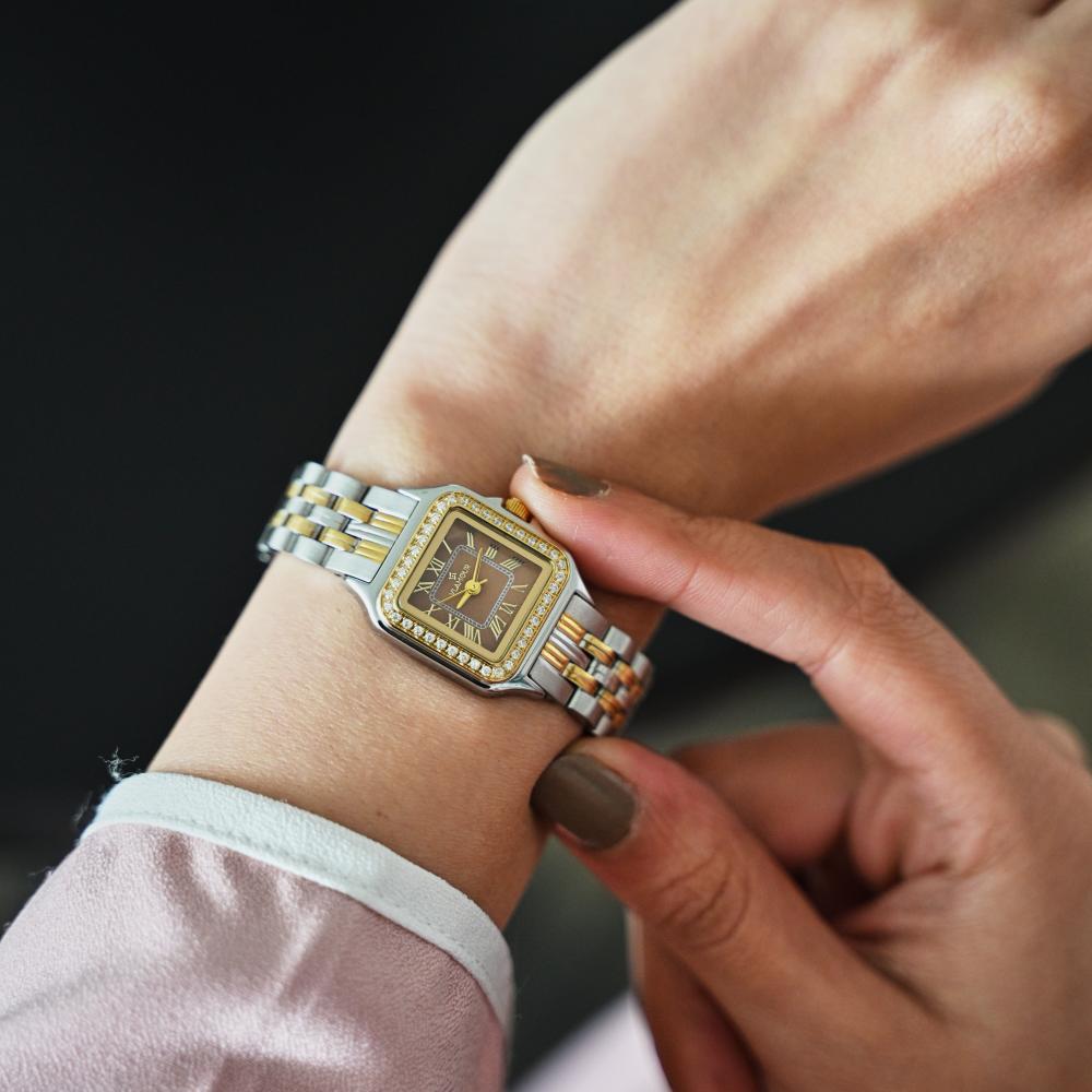 ساعة نسائية رقيقة التصميم السوار ستيل فضي وذهبي الصف الأوسط ذهبي اللون أما الصفان الجانبيان فضيان والعلبة تأخذ شكلًا مربعًا لكن زواياها ليست حادة بل مستديرة وإطار العلبة ذهبي مرصعًا بحبات كريستالية صغيرة بشكل مربع، الميناء له لون بني والأرقام المستخدمة رومانية ذهبية اللون، موجودة عند الأرقام الأساسية الأربعة، بينما النقاط الصغيرة تحدد باقي علامات الساعات، يوجد في الساعة عقربان رفيعان باللون الذهبي، هذه الساعة مميزة فعلى الرغم من أنها قطعة صغيرة إلا أنها تُحدث فرق كبير في إطلالتك.