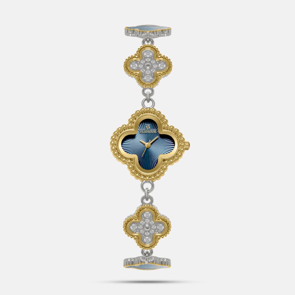 ساعة نسائية ستيل بلون ذهبي من فلامور تعكس توازنًا مدروسًا بين التصميم الكلاسيكي واللمسات العصرية. تظهر أناقتها في الحجم الصغير بدقة 25 مم، مع ميناء أنيق مزخرف ومسطر بتفاصيل دقيقة. يحيط بالميناء إطار لامع مرسوم على شكل وردة تضفي حضورًا راقيًا، بينما يكتمل المشهد مع سوار زخرفي مزيّن بفصوص براقة متداخلة في شكل وحدات تشبه الورود. يعمل هذا التصميم بدقة عالية من خلال آلية كوارتز ثابتة تضمن المحافظة على الوقت بجمالية متينة، في قطعة صنعت بشغف في المملكة العربية السعودية مع ضمان يمتد لثلاث سنوات.