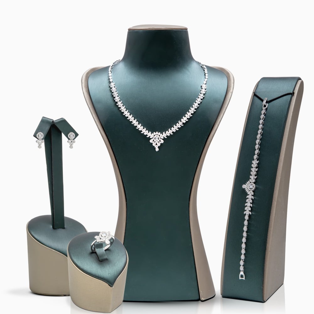 طقم يجمع فيما بين البساطة والأناقة والمظهر الأنثوي المتميز، متجر فلامور يقدمه مكون من قلادة تتكون من صفين مرصعة بصفوف من الزركون، وحلق وخاتم وانسيال يتميز بالرقة والجمال، وأهم ما يميزه أنه ذو جمال فريد ولا مثيل لها يبرز جمالك الطبيعي، ويتميز بالعديد من المميزات والتي جاءت كالتالي:-
