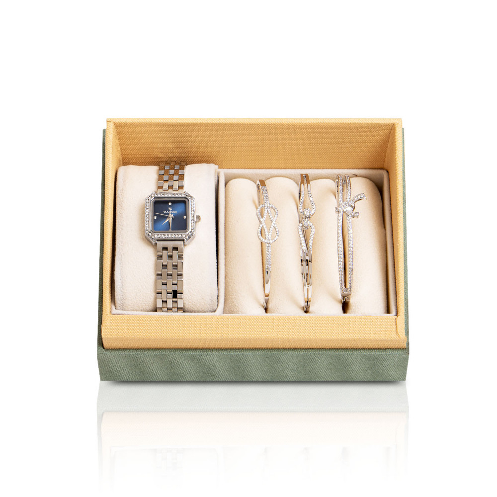 · الساعة مرفقة بثلاث أساور كل منها بتصميم مختلف ولكنها اجتمعت على البساطة والنعومة واحتوائها على الماسات الصغيرة التي تمنحها ريقاً أخاذاً، يمكن أن ترتديها مع بعضها دفعة واحدة أو تختاري منها واحدة.